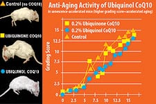 Aging humans suffer a precipitous decline in coenzyme Q10 synthesis that correlates with increased risks of multiple degenerative diseases.23,53-73 Gerontologists have long theorized that if one could maintain youthful mitochondrial energy levels, many deleterious effects of aging could be postponed. CoQ10 is a critical factor involved in healthy mitochondrial energy production. To ascertain the age-retarding effects of ubiquinol, scientists conducted a meticulous study of senescence-accelerated mice.74 One reason this mouse model is used is that it enables researchers to quickly identify compounds that may slow aging. Senescence-accelerated mice grow normally, but show early signs of aging, including reduced physical activity, loss of hair glossiness, coarse skin, hair loss, ocular lesions, and curvature of the spine. In this study, the senescence-accelerated mice were divided into three groups. Starting at two months of age, the first group continued to receive standard lab chow, while the second group’s lab chow was fortified with conventional (ubiquinone) CoQ10, and the third group’s lab chow was fortified with ubiquinol CoQ10.74 A grading score developed by the Council for Senescence Accelerated Mouse Research was used to evaluate the aging rate of the three groups of mice. A higher grading score means that biological aging is occurring faster. At three months of age, the grading score was about 0.0 for all three groups.74 As would be expected, the aging rate spiked sharply higher in the control group (not receiving any CoQ10) starting around three months of age. Mice receiving ubiquinol or ubiquinone CoQ10 showed a slower rate of aging after three months compared to the placebo group, as shown in Figure 4 (next page).74 When middle age set in (at about nine months of age), the placebo group grading score spiked up to 10.0, whereas the grading score of the groups receiving ubiquinol or ubiquinone increased to only 5.5. This translates into a 45% slower rate of aging for mice receiving ubiquinol or ubiquinone compared to placebo.74 So at nine months, it is clear that either form of CoQ10 (ubiquinol or ubiquinone) markedly slowed measurements of aging. At 10 months of age, however an incredible divergence was observed. As shown in Figure 4, the placebo group’s grading score spiked to 12, the ubiquinone group score reached 9.9, whereas the ubiquinol group score only increased to 5.9. Therefore, at a point that translates into late middle age, mice receiving ubiquinol aged 51% slower than placebo and 40% slower than the group receiving the ubiquinone form of CoQ10.74
