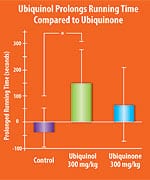At 12 months of age, the difference in the groups was so remarkable that the researchers decided to take photos of the mice in each group. As can be seen by the photos on the next page, a mouse receiving ubiquinol appears to be perfectly healthy, whereas a mouse receiving ubiquinone has suffered noticeable degenerative changes. The mouse receiving neither form of CoQ10 looks absolutely ghastly. As can be seen in Figure 4, at 12 months, there is relatively little difference between the placebo and ubiquinone groups in grading scores, whereas the group receiving ubiquinol shows a 22% slower rate of aging. The most startling data this chart shows, however, is that mice receiving ubiquinol dramatically slowed the rate at which age-induced degenerative changes occurred in mid-life and to a lesser degree in later life. Video Footage of 12-Month-Old MiceThe still pictures of 12-month-old mice that received ubiquinol, ubiquinone, or the control (placebo) speak for themselves. What is even more impressive is video footage comparing the different groups of mice. A video shows that in response to no supplemental CoQ10, the mouse is essentially immobile and unresponsive, exhibiting lesions in and around the eye, with spinal and limb deformities as well as a patchy, discolored coat. Many of these pathological events seen in mice not supplemented with CoQ10 are classic signs of degenerative aging suffered by elderly humans. The 12-month-old mouse supplemented with ubiquinol, on the other hand, is shown to be alert, responsive, and energetic, with no physical lesions or deformities and a glossy coat resembling that of a young, healthy mouse. Anti-Fatigue Effects of Ubiquinol in Aged RatsA universal pathological effect inflicted by aging on living organisms is mitochondrial energy depletion that manifests outwardly as fatigue. The primary mechanism by which CoQ10 protects against age-related degeneration is helping to maintain mitochondrial energy output.3