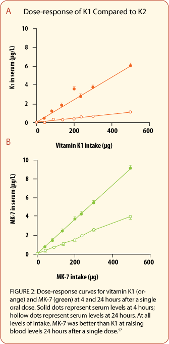 A study compared the absorption and arterial wall uptake of vitamin K1 and K2. This study is important because of the large body of epidemiological data showing significant reductions in heart attack risk in those ingesting high amounts of vitamin K2. The results of this study showed that vascular cells preferentially take up vitamin K2 compared with vitamin K1. The poor absorption of K1 into vascular cells helps explain why K1 has not conferred significant protection against heart disease.32 The scientists who conducted this study next evaluated the effect of the K2 absorbed into vascular smooth muscle cells. Their findings documented that K2 enables the formation of smooth vascular muscle without nodules, such nodules that can protrude through into the endothelium and contribute to arterial blockage and atherosclerosis.50 The Long-Acting Form of Vitamin K2There are two forms of vitamin K2 that have demonstrated remarkable benefits in published scientific studies. The MK-4 form of vitamin K2 is the most rapidly absorbed and has proven clinical benefits. Yet MK-4 remains active in human blood for only a few hours after ingestion. The MK-4 form shows activity as an anti-atherosclerotic, has anti-tumor effects in some cancer cells, and helps to aid in bone formation activity.51-56 The MK-7 form of vitamin K2, on the other hand, remains bioavailable in the human body many days after ingestion and is the form found naturally in natto (fermented soybeans).57 In a human clinical trial, comparisons of bioavailability after ingestion of vitamins K1 and K2 (MK-7 form) were performed. The results showed that over a 24-hour period, MK-7 was present in the blood 2.5-fold better than K1. Over a 96-hour period, MK-7 was six-fold better than K1.57 (Shown to the right on Figure 1.) A dose-response study was done where healthy volunteers received increasing doses of K1 and K2 (MK-7). The results showed no effect of K1 observed 24 hours after a 200 microgram dose, whereas 100 micrograms of K2 provided optimal vitamin K blood levels over a 24-hour period.57 (Shown to the right on Figure 2.) A third clinical study compared K1 with K2 (MK-7 form) at the same dose over a six-week period. Compared with K1, the level of MK-7 form of vitamin K2 was seven- to eight-fold higher in the blood and there was no cumulative effect of K1! This suggests that MK-7 is more efficacious than K1.57 (Shown to the right on Figure 3.) Efficacy of the MK-7 Form on a Marker of Bone HealthA sensitive indicator of vitamin K status in the body is the amount of activated osteocalcin in the blood.58 Osteocalcin is produced mainly by osteoblasts (bone-forming cells) and when activated by vitamin K, has properties that allow calcium and other minerals to be laid down into the bone, promoting bone density. When compared with K1, the MK-7 form of vitamin K2 was found to be three times more effective in promoting activated osteocalcin, indicating greater benefits for the bone.57 High bone turnover is associated with bone loss. One aim of osteoporosis prevention is to decrease bone turnover. A higher amount of inactivated (under-carboxylated) osteocalcin is correlated with reduced bone mass. When administered to a group of study subjects, MK-7 was shown to decrease bone turnover and increase bone density.59 A variety of studies done in humans and animals provides much support for the use of MK-7 in the prevention of osteoporosis.59-62 It should be noted that these markers not only provide a partial indication of overall bone health but hint of a strong protective effect of the MK-7 form of vitamin K2. | |||||||