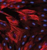 | Embryonic stem cells can turn into all the cells of the human body. Here, smooth muscle cells are stained red while the nuclei are stained blue. |