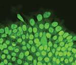 | The age-reversed cells in the study are shown here stained for a marker called “Oct4”, a protein normally only expressed in the immortal reproductive lineage. |