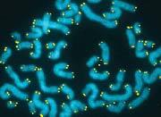 | The clock of cellular aging resides at the very ends of the chromosomes, regions called “telomeres.” Shown here in a blue color are stained human chromosomes, and the telomeric DNA is stained bright yellow. |