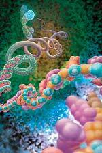 | Illustration of a telomere: Telomeres consist of a DNA sequence (TTAGGG) that is repeated over and over again, forming the tips or “caps” of our chromosomes. Breakage or erosion of telomeres as a result of age can trigger cascades of events that lead to tissue degeneration. The telomere is shown being unwound from a chromosome (top left). |