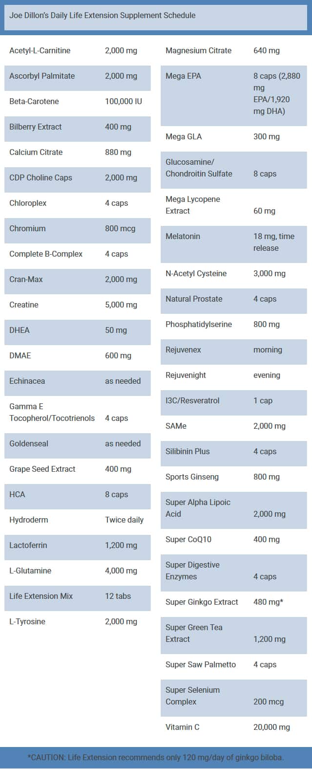 Life Extension products are a prominent feature of his health program. “In 1990, I became aware of pharmaceutical-grade supplements,” Dillon says. “Life Extension’s products are really pure. I can actually feel a difference right away.” His daily health program incorporates more than 40 vitamins, minerals, and other supplements.
