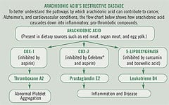 One potentially dangerous substance that has been found in the brains of Alzheimer's sufferers is the COX-2 enzyme. Some research has shown a link between excess COX enzymes and prostaglandins with more beta-amyloid in brains. Elevated COX-2 has also been found in hippocampal neurons of people with Alzheimer's, and has been correlated with the withering of neurons and more dense plaques in that region of the brain.22 Another theory suggests that prostaglandins produced by the COX enzymes may also increase the effects of a neurotransmitter called glutamate. Neurotransmitters such as glutamate help nerve cells communicate. If too much glutamate lingers in the space between neurons, it can overstimulate the cells, causing them to die. Researchers have proposed that inhibiting the COX enzymes and thus reducing prostaglandins could reduce the excess stimulation caused by glutamate, thus protecting cells against inflammation and neurodegenerative disease.23-25 Regular use of anti-inflammatory drugs, particularly aspirin, has been associated with a lower prevalence of Alzheimer's disease, along with improved preservation of cognitive function. For example, a meta-analysis examined the use of NSAIDs in relation to the development of Alzheimer's disease in adults over the age of 55. Individuals who regularly used anti-inflammatory drugs had a decreased risk of developing Alzheimer's, and the risk reduction increased as the duration of anti-inflammatory use lengthened. People who used the anti-inflammatory medications for 24 months, for example, had an amazing 73% reduced risk of developing Alzheimer's.26 An analysis of more than 700 individuals over the age of 80 showed that those who regularly used aspirin had a markedly lower prevalence of Alzheimer's dementia. Furthermore, this group maintained better cognitive function than those who did not use aspirin.27 | ||||||