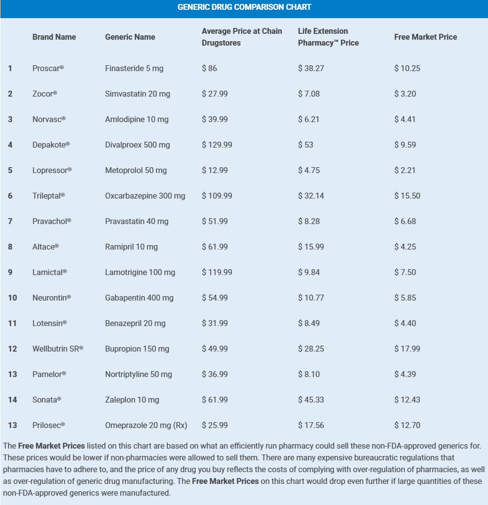 On average, Americans are paying 837% more at chain pharmacies and 236% more at the Life Extension Pharmacy™ compared with what the free market price would be for the identical medications.