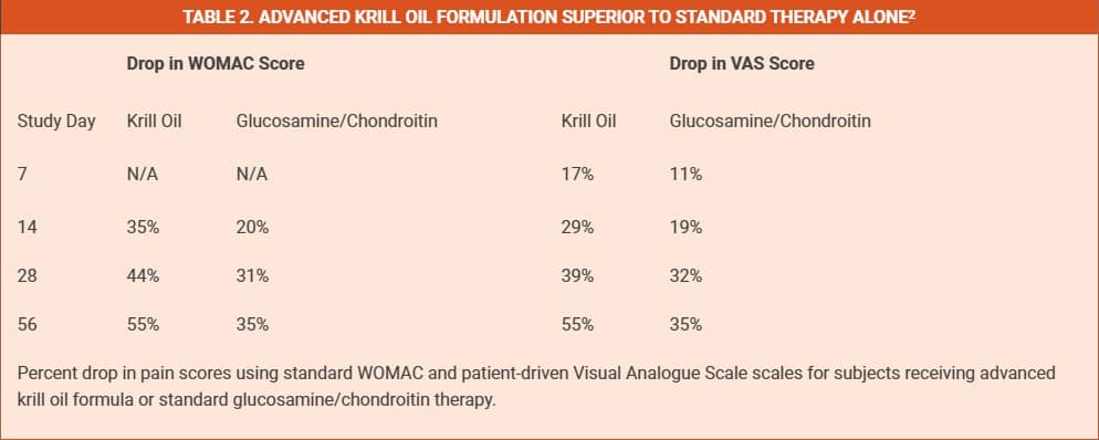WOMAC scores measured on days 14, 28, and 56 of the study demonstrated a progressive drop in pain severity.2 When the effect of the placebo was controlled for, the krill oil formulation vividly outperformed the glucosamine/chondroitin positive control as well, achieving a 55% reduction in WOMAC pain score reduction by day 56 (See table 2 below).