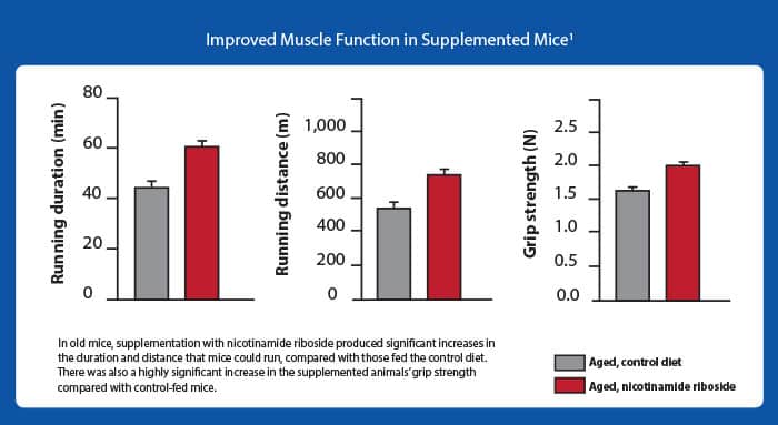 - Aged mice supplemented with nicotinamide riboside demonstrated increases in maximal running times and distances, and in grip strength.