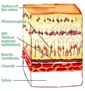 Macular Degeneration Macular degeneration is the leading cause of acquired blindness and vision impairment among elderly Americans. It is estimated that up to 17 million elderly Americans have at least early signs of the disease called age-related maculopathy. The National Eye Institute estimates that nearly 1.7 million elderly Americans have the more advanced stage of macular degeneration, and a new case is diagnosed every three minutes. The prevalence of the disease increases with age, affecting one in six Americans aged 55 to 64 and one in three Americans over 75. Of the 1.7 million currently afflicted, nearly 85% have the most prevalent form of the disease, known as dry macular degeneration.2,33,34 Patients who are affected suffer a gradual loss of central vision due to the death of photoreceptor cells (rods and cones) and their close associates, retinal pigmented epithelium cells. Photoreceptors are the cells in the retina that actually “see” light and are essential for vision. Retinal pigmented epithelium cells are like the “nursemaids” for photoreceptor cells and are necessary for photoreceptor survival. The death of either of these cell types leads to the death of the other. The macula contains the highest concentration of cone-type photoreceptors that are responsible for providing color and fine detail in the center of the visual field. Thus, patients with macular degeneration gradually lose their central vision and with it, the ability to drive, read, and see the faces of loved ones. As bad as this may be, those suffering the disease can function at a reasonable level for many years. However, another aspect of macular degeneration is even more devastating. As the photoreceptor and retinal pigmented epithelium cells slowly degenerate, blood vessels tend to grow from their normal location in the choroid into an abnormal location beneath the retina. This abnormal new blood vessel growth is called choroidal neovascularization, or wet macular degeneration. Abnormal blood vessels leak and bleed, resulting in sudden and severe loss of central vision. Depending on the location, laser treatment can sometimes be given to destroy the blood vessels. When retinal cells are lost, they are not replaced and central vision loss can be profound. New drugs are currently under development for wet macular degeneration, but their availability may be years away.