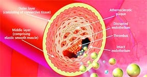 Anatomy of the ArteryArteries are the blood vessels that bear the full force of each heartbeat. Laypeople often think of arteries as flexible tubes whose only function is to carry blood that flows continuously throughout the body. In reality, arteries are dynamic, functioning muscular structures that in good health expand and contract to facilitate circulation and maintain optimal blood pressure. The artery’s outer layer mostly consists of connective tissue and provides structural containment for the two layers beneath. The middle arterial area comprises elastic smooth muscle that provides the contractile strength to make possible the artery’s expansion and contraction with each heartbeat. The inner layer—known as the endothelium—consists of a thin area of endothelial cells whose integrity is crucial if atherosclerosis is to be prevented. A vital function of the endothelium is to form a barrier to prevent toxic substances in the blood from entering the elastic smooth muscle in the middle vessel wall. Another specialized function of the endothelium is to react to mechanical forces such as blood pressure and blood flow generated by the heart’s beating action. The endothelium releases substances into cells of the middle layer smooth muscle that changes the tone or firmness of the artery. When endothelial cells sense an injury, they produce signals that prompt smooth muscle cells in the middle arterial wall to change. These changes result in the smooth muscle cells moving toward the site of vascular injury, where they reposition themselves just beneath the endothelial cell layer. In reaction to injury, endothelial cells also produce substances that signal circulating blood cells to stick to the endothelium (instead of effortlessly flowing through the vessel). Atherosclerosis gradually forms in response to this initial injury to the endothelium.