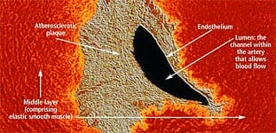 The lipids that accumulate in the broken endothelium become oxidized. This causes them to signal the endothelial cells, which then alert smooth muscle cells to begin a “repair” process that eventually results in an atherosclerotic lesion. Depending on a person’s individual risk factors (such as poor diet, lack of exercise, smoking, high blood pressure, and the aging process itself), fat accumulation continues and the atherosclerotic process accelerates. White blood cells called macrophages then invade the area to digest the fat. Smooth muscle cells that have migrated to the area have already changed their nature to also scavenge fat. These fat-laden white blood cells and smooth muscle cells, which are called “foam cells,” induce chronic inflammatory attack by various immune components. Smooth muscle cells try to curtail the injury to the endothelium by producing collagen, which forms a cap over the injury site. Then calcium accumulates and forms a material resembling bone. This is why atherosclerosis used to be referred to as “hardening of the arteries.” This complex array of foam cells, calcification, and lipid accumulation is called an atherosclerotic plaque. The plaque grows, and if it becomes unstable, is vulnerable to acute rupture that exposes its contents to the blood. Platelets can then rapidly accumulate around this ruptured plaque, resulting in a blockage (or blood clot) on the inner surface of the blood vessel wall. This clot can become very large and occlude the vessel. Even small plaques, if they rupture, can interfere with blood flow and cause an acute heart attack. Alternatively, atherosclerotic plaques can enlarge to such a degree as to completely block blood flow. When blood flow within an artery is severely compromised by a large plaque or blood clot, the cells of tissues that depend on blood flow from that artery become damaged or die. Coronary atherosclerosis cuts off the heart’s blood supply by occluding the heart’s arteries, thus stopping the oxygen supply to the heart and causing a heart attack. A stroke results when atherosclerosis processes cut off the oxygen supply to a portion of the brain.