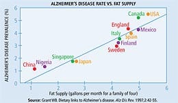 Diet and SupplementsAn important research project illustrates the negative effects on the brain of a diet high in saturated fat. William Grant, PhD, discovered that countries with the highest intake of saturated fat and calories also had the highest incidences of Alzheimer’s disease. By contrast, Asian countries, which had the lowest intake of saturated fat, also had the lowest incidences of the disease. Therefore, when creating your menu, it is very important to include a balanced diet rich in fruits and vegetables and low in trans and saturated fats, such as those found in processed foods and red meat. Recent studies have also shown that eating soy may help prevent memory decline. My Better Memory Diet™ recommends eating five to seven servings of fresh (preferably organic) fruits and vegetables each day, along with sources of protein that contain little or no trans and saturated fats but are rich in omega-3 fatty acids, such as wild Alaskan salmon. Unfortunately, due to widespread mercury contamination, we must be both cautious and selective about which fish we consume. Omega-3 fatty acids are “good fats” needed by your brain to function well. Your brain does not need trans and saturated fats, otherwise known as “bad fats.” Because most people cannot get enough of their required daily nutrients from dietary sources, it is important for everyone to take a high-potency multi-vitamin. Additionally, the following memory-specific nutrients may be helpful for many people: