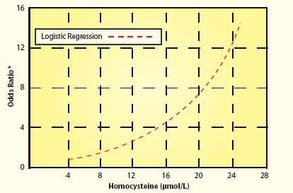 The Study Period Was Too Short!Based on the enrollment criteria, the study subjects had already suffered significant arterial damage over most of their lifetime. The study design expectation was that within two or three years, taking modest doses of only three nutrients would somehow protect the test subjects against future vascular events. Please note the word “within” when describing the study period. While the first study lasted two years and the second study lasted a little over three years, any participant who encountered a vascular event even one day after the study’s commencement was considered a statistic. In other words, if a study participant suffered any kind of vascular disease after they took even one dose of B vitamins, then that person was listed as a “failure,” meaning that he or she filled a statistical column showing no benefit to B vitamins as far as this study was concerned. Remember that these were high-risk participants with pre-existing vascular disease. It is absurd to expect that moderately lowering homocysteine within a very short time period would result in a miraculous disease reduction in these unhealthy individuals. As any enlightened person knows, atherosclerosis does not develop overnight. Initial arterial lesions are sometimes seen in teenagers. The process of inner arterial wall degradation leading to atherosclerosis lasts for many decades. When one has pre-existing vascular disease—as was the case for most of these study subjects—the arteries are severely damaged and the risk of future arterial-related diseases is high. For people with pre-existing arterial disease, protecting against a future heart attack or stroke requires extraordinary effort. Swallowing one modest-dose daily supplement after you have developed significant vascular disease is not going to do it! Baseline Homocysteine Levels May Not Have Been High EnoughWe discussed before that the two studies failed to adequately reduce homocysteine levels to optimal safe ranges. While that is one significant flaw, another defect in these two studies was that the subjects’ homocysteine levels were not particularly high to begin with. To clarify this point, while some studies show that homocysteine levels above 7-9 µmol/L increase vascular disease risk, the most lethal effect occurs when levels exceed 13-15. The subjects chosen for these two studies had baseline homocysteine levels of 12.2 and 13 on average, which were reduced to 9.7 and 9.6, respectively. Existing data indicate that there may not have been much of a statistical difference between the study subjects’ baseline levels and their homo-cysteine levels two and three years later. The following chart using data from a study published by the American Heart Association helps explain why the baseline homocysteine levels in these two studies may not have been high enough.58 As one can see, cardiac risk increases incrementally with rising homocysteine. Generally speaking, when the odds ratio exceeds 2.0 or 2.5 in epidemiology studies, scientists become concerned that risk increases. In this chart, a homocysteine level of about 13 µmo/L corresponds to an odds ratio of about 2.0 to 2.5. From the chart, the risk associated with a homocysteine level of 13-15 is 4 to 5 times greater compared to the risk associated with a homocysteine level of 7-8.It should be noted that this chart uses logistic regression to describe heart attack risk in relationship to increasing homocysteine levels.