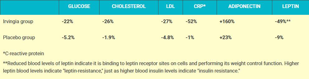 These remarkable blood marker changes reveal specific mechanisms responsible for the profound weight loss effects observed in subjects receiving Irvingia. These beneficial blood marker changes would also confer considerable protection against diabetes and vascular disease beyond the fat loss benefits.