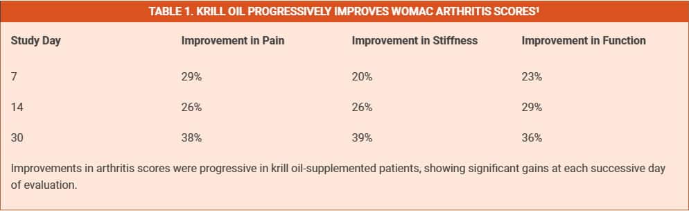 The WOMAC score assesses levels of pain and stiffness in patients with osteoarthritis. After just 7 days of supplementation, CRP was significantly reduced by 19.3% in the krill-supplemented group, while it rose by 15.7% in the placebo group.1 CRP dropped an additional 30% and 31% at days 14 and 30, respectively, in the krill arm of the study, while it rose by 32% at day 14 in the placebo group.