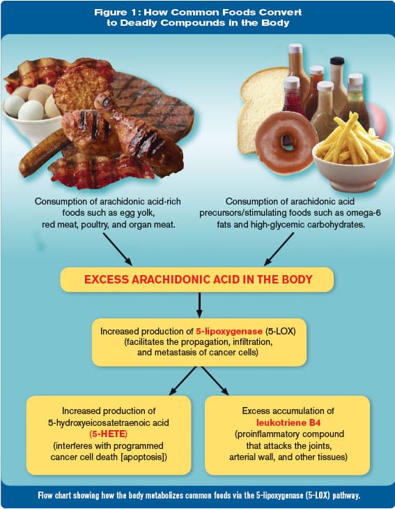 In response to arachidonic acid overload, the body increases its production of enzymes like 5-lipoxygenase (5-LOX) to degrade arachidonic acid.48 Not only do 5-LOX products directly stimulate cancer cells propagation, but the breakdown products that 5-LOX produces from arachidonic acid (such as leukotriene B4, 5-HETE, and hydroxylated fatty acids) cause tissue destruction, chronic inflammation, and increased resistance of tumor cells to apoptosis (programmed cell destruction).19-21,48-58