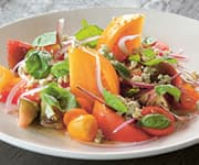 To Serve: Arrange the tomatoes on 4 plates or a large platter. Sprinkle with shaved red onion. Next, place both types of basil on top, tearing large leaves but leaving small leaves whole. Dress the salad with the vinaigrette, season with salt and pepper, and sprinkle with the blue cheese crumbles.