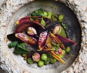 Place the blanched peas on top of the miso, dress the snow peas (mangetout) and pea shoots in the extra-virgin olive oil, then place them on top of the peas and miso. Garnish with the red speckled snow pea flowers and serve.