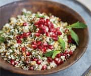 Pulse the cauliflower florets in a food processor until they are broken down to couscous-size crumbles. Transfer the cauliflower to a large bowl. If there are any large pieces left, return them to the food processor and pulse until they reach the desired size, then add them to the bowl. Add the sesame seeds, pine nuts, pumpkin seeds, sunflower seeds, nigella seeds, cilantro, mint, and parsley to the bowl with the cauliflower.
