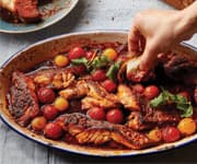 Add the fish fillets, skin-side up, tucking them gently into the sauce. Sprinkle the remaining ½ pint (225 g) cherry tomatoes on top of the fish.
