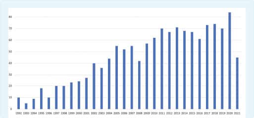 The National Library of Medicine provides free access to its massive data base of scientific papers (www.Pubmed.gov). This graph shows the surging number of published studies that discus “broccoli and cancer” as of mid-2021.