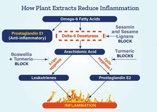 A preclinical study showed that the sesame oil component known as sesamin inhibits the delta-5-desaturase enzyme,21 thus shunting more omega-6 fats away from pro-inflammatory pathways to anti-inflammatory prostaglandin E1.