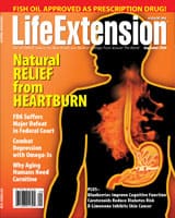 Reports On the cover: Natural relief from heartburn! By Russell Martin Why you need more omega-3 fatty acids Omega-3 fatty acids show promise in fighting deadly cancers, by Julius G. Goepp, MD Brain food: Safely manage depression with omega-3 fatty acids, by Mark J. Neveu, PhD Doctors overlook benefits of omega-3 fatty acids for bone health, by Dale Kiefer Natural arthritis relief with omega-3 fatty acids, by Dale Kiefer Why aging humans need more carnitine, by Julius G. Goepp, MD Departments As we see it: Fish oil now available by prescription! By William Faloon In the news: Life Extension phytoestrogen formula protects brain, nervous system; High blood pressure now common in teens; Folic acid may halt cancer progression; Calcium, vitamin D supported for bone health; Omega-3 fatty acids reduce back, neck pain; Carotenoids cut diabetes risk in nonsmokers; Cinnamon extract promotes healthy blood sugar levels; Oral contraceptives deplete CoQ10, vitamin E; Osteoporosis drug may stabilize advanced prostate cancer; Limonene, perillic acid counter spread of cancer; Melatonin may protect against breast cancer; New York state joins national fight against childhood obesity Wellness Profile: Gary Goldfaden, MD, pioneering a natural approach to skin care, by Sue Kovach Ask the doctor: Fiber’s critical role in preventing cardiovascular disease, by Steven A. Schnur, MD September, 2006 abstracts: Omega-3 fatty acids, blueberries, carnitine https://www.lifeextension.com/magazine/mag2006/mag2006_09.htm | ||||||||||||||||||||||||||||||