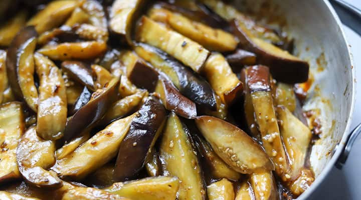 - Make the sauce by combining light sodium soy sauce, water, sugar and cornstarch. Add the sauce to the pan of cooked eggplant and stir well to coat the eggplant. Cook for 5 minutes, stirring often.