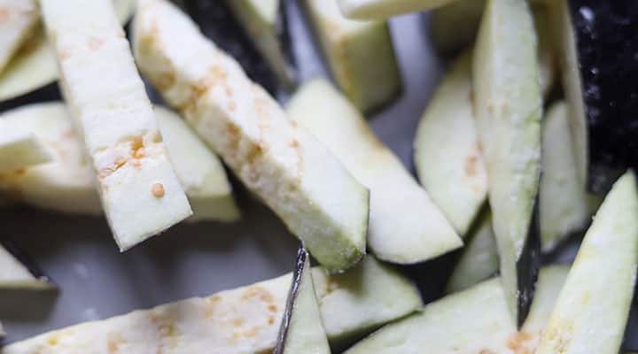 Optional: If using Italian or American eggplant, prep them by cutting them into thumb-sized pieces and sprinkling with 1 teaspoon of salt. Let the eggplant sit and sweat for 10 minutes. This salting draws out the bitter juices. You will see beads of liquid collected on the outside of the salted eggplant when it is ready. At that point, rinse the eggplant under cold water and pat it dry with paper towels.