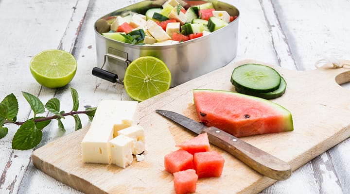 Nutritionally, they are a power couple! Feta cheese contains sodium, a key electrolyte lost through sweat, and watermelon is rich in fluids and potassium. Plus, feta is a source of protein and calcium. Together, they form an ultimate hydrating, electrolyte-rich dish. Though keep in mind that many Americans meet or exceed their daily sodium allowance. Athletes in particular should ensure they are replenishing sodium and other electrolytes.